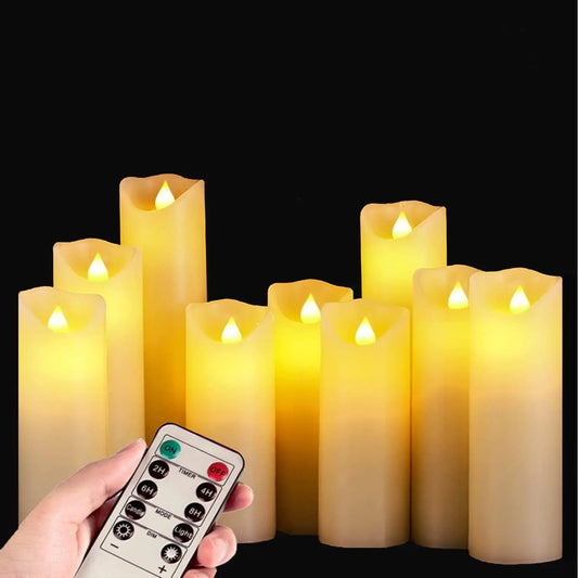 Set of 9 Real Wax Pillar Flickering Battery Candles With 10 key Remote Control Timer 300 Hours
